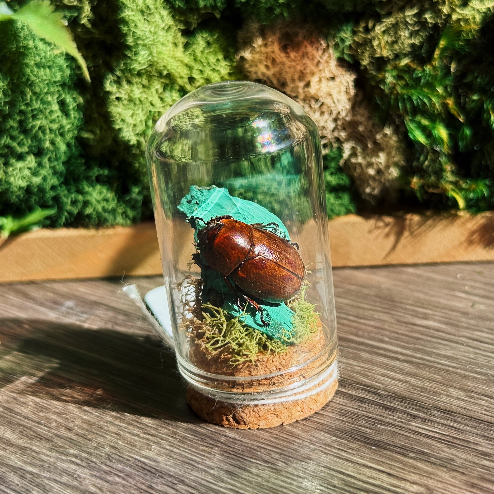 Features preserved moss, a crystal, natural flora, and a preserved beetle