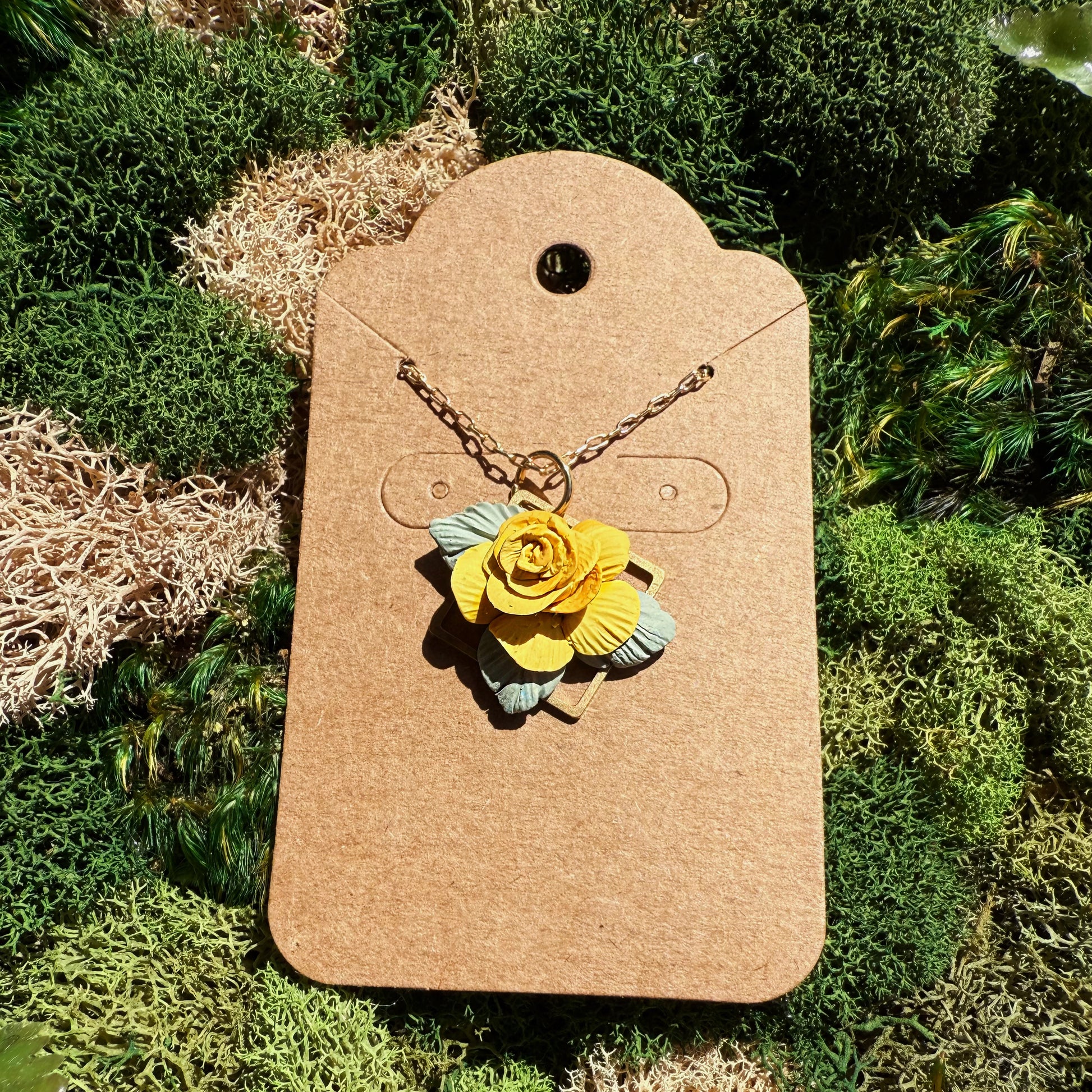Each pendant is carefully sculpted by hand, with every petal and leaf individually formed and layered to create lifelike floral arrangements. No molds, no shortcuts—just patience, artistry, and a love for nature’s quiet intricacies. The result is a unique, lightweight piece that captures the essence of blooming botanicals in lasting form.