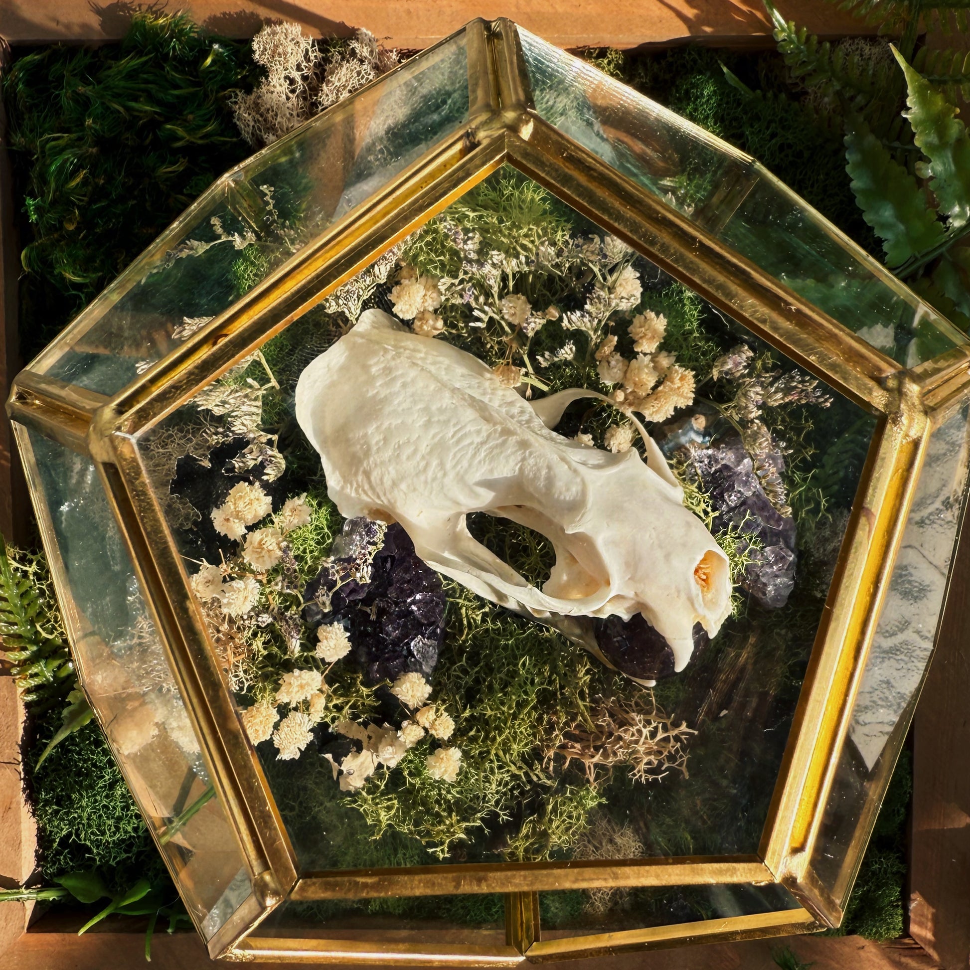 Features preserved moss, a mink skull, a polished amethyst marble, two raw amethyst clusters, and preserved white florals
