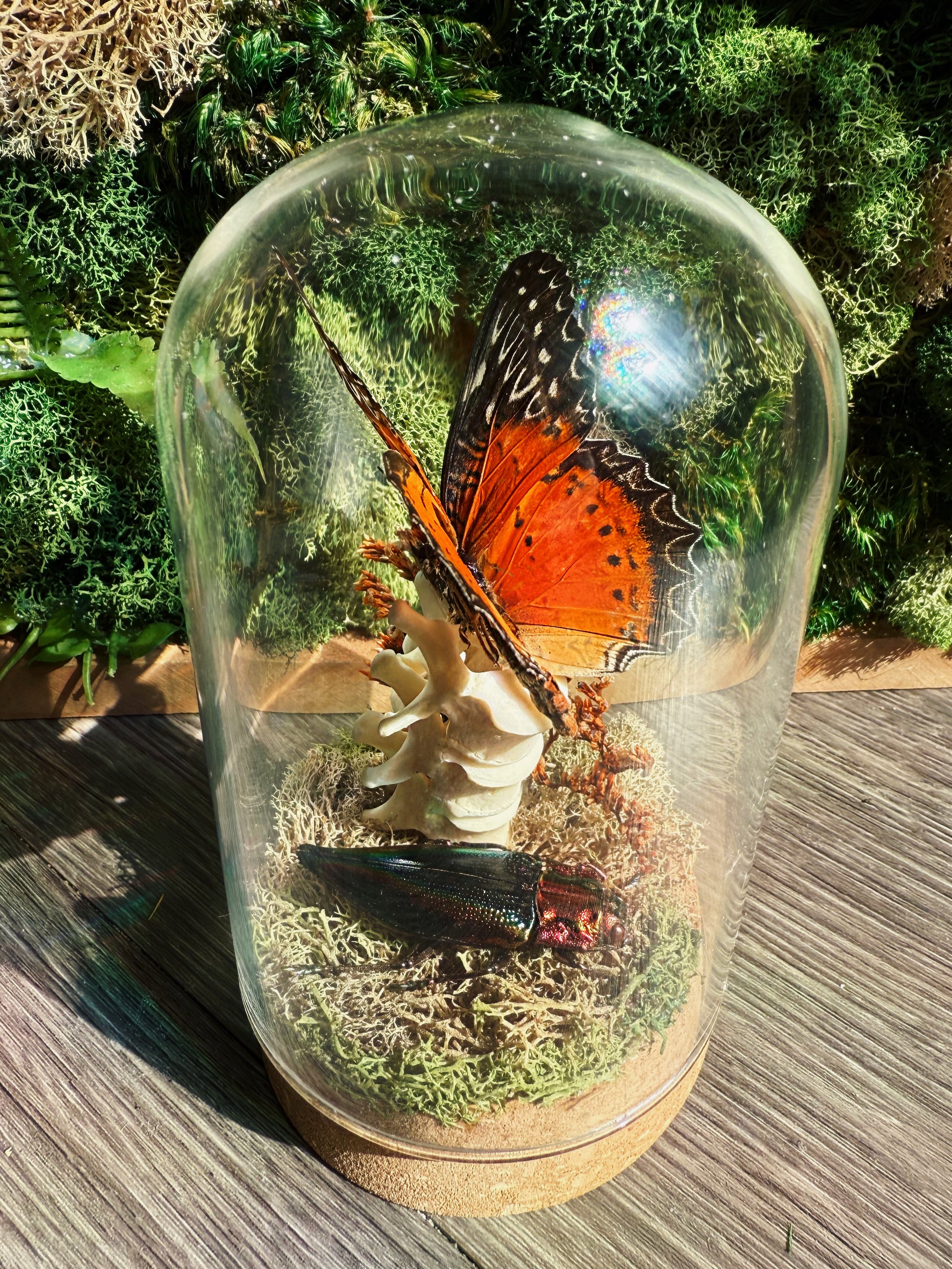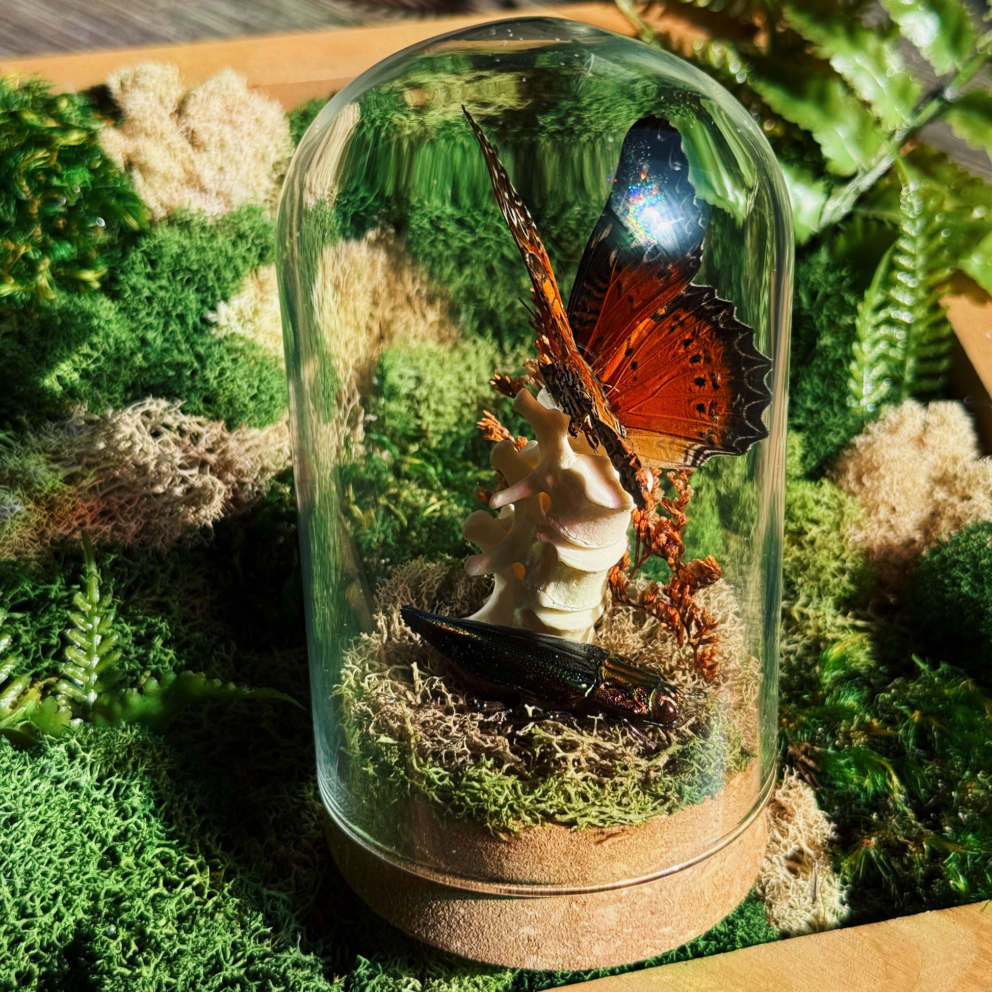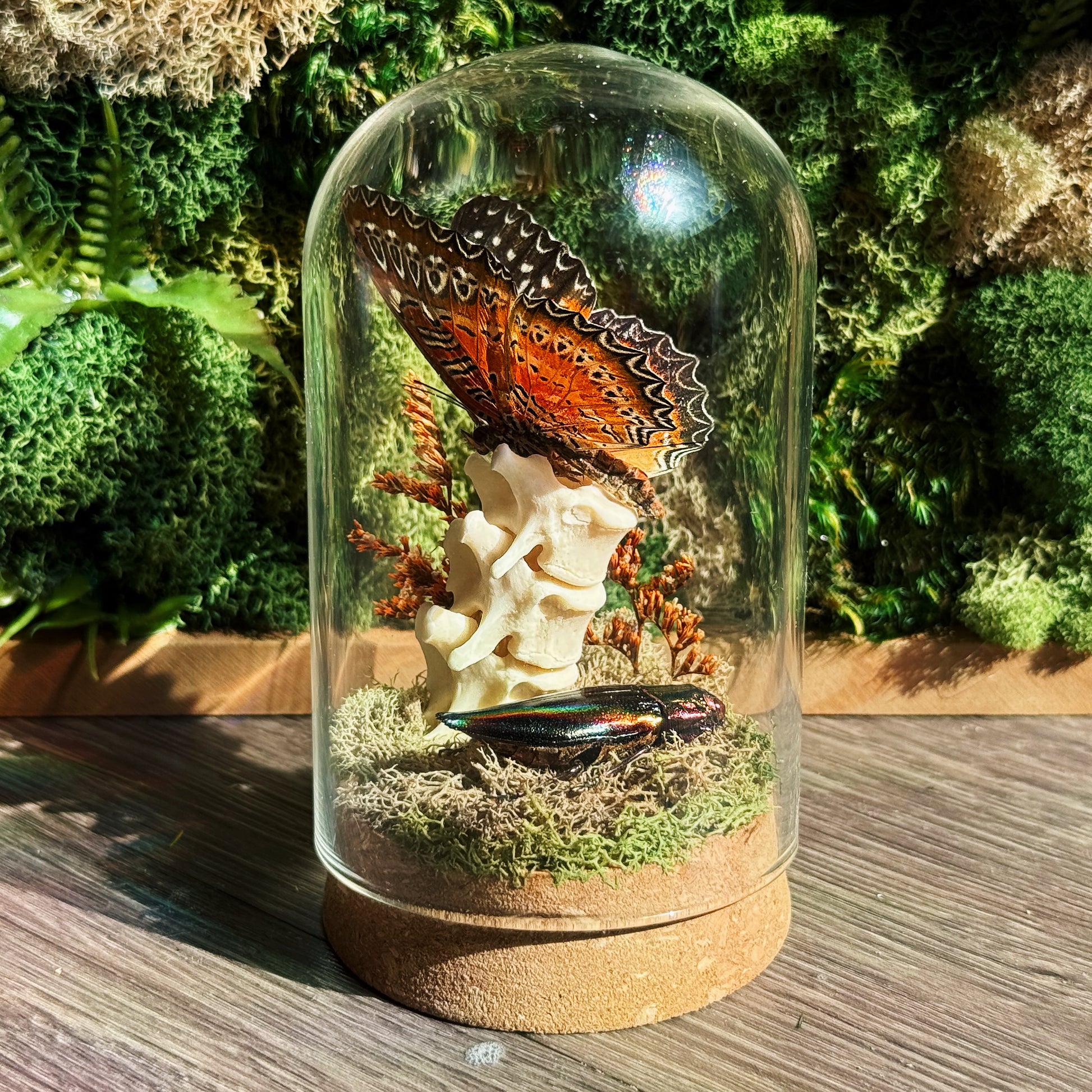 Step into a miniature world where natural history meets delicate beauty. This medium-sized glass dome terrarium features a striking vertical arrangement of three stacked raccoon vertebrate bones, creating a sculptural centerpiece that evokes both curiosity and reverence. Nestled among soft green preserved moss, you'll discover a vivid orange, white, and black butterfly poised in eternal stillness, alongside a stunning rainbow iridescent beetle that catches the light with every angle.