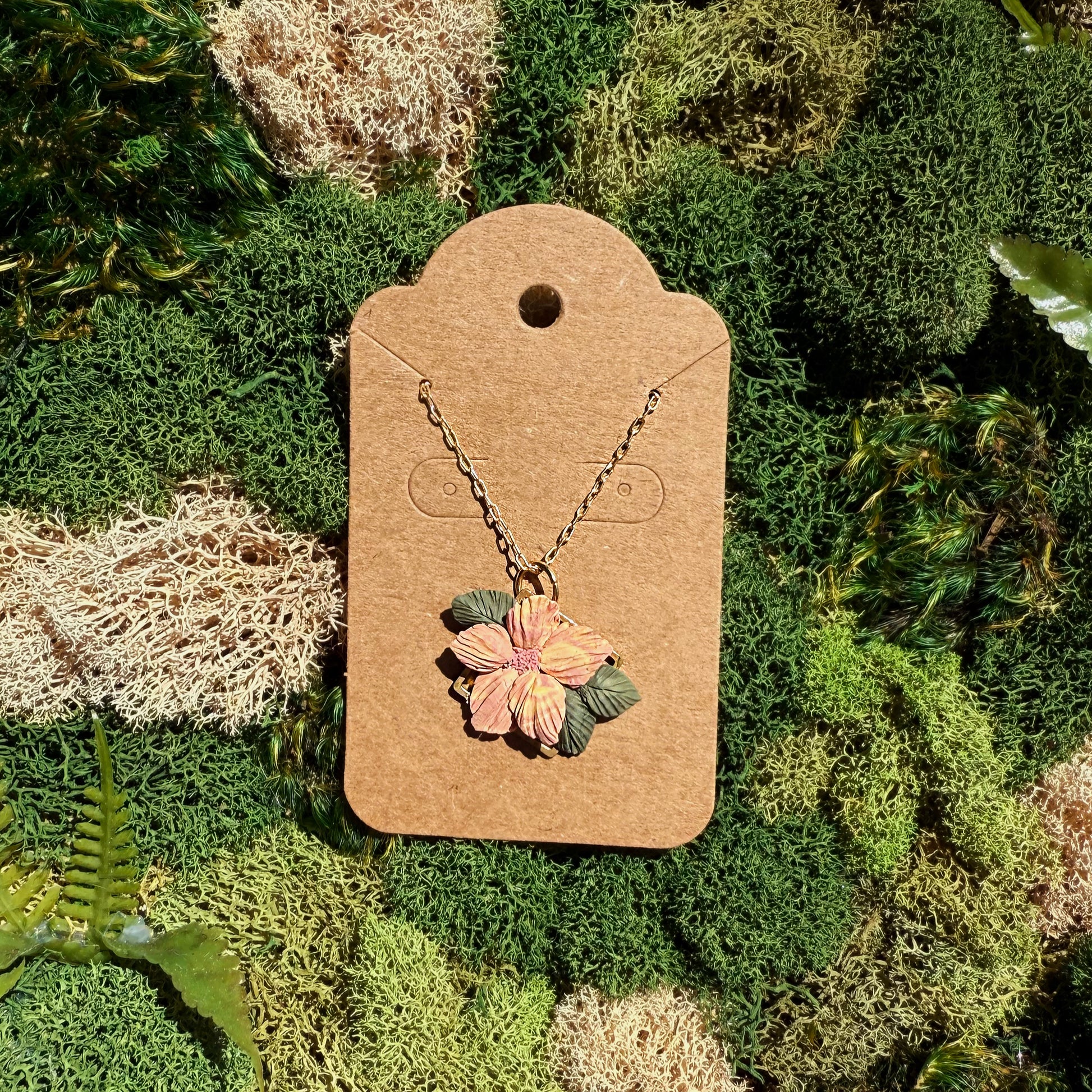 Each pendant is carefully sculpted by hand, with every petal and leaf individually formed and layered to create lifelike floral arrangements. No molds, no shortcuts—just patience, artistry, and a love for nature’s quiet intricacies. The result is a unique, lightweight piece that captures the essence of blooming botanicals in lasting form.